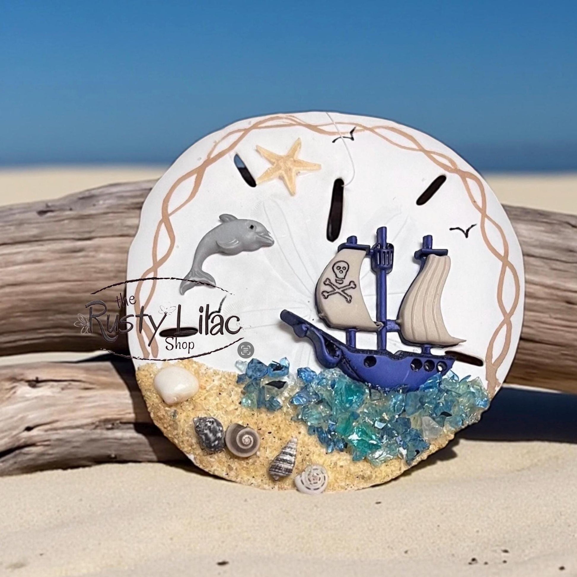 *This handcrafted sand dollar ornament features a pirate ship floating above a sea of crushed glass accented by a real starfish sun, a frolicking dolphin, and assorted seashells ❤️.
