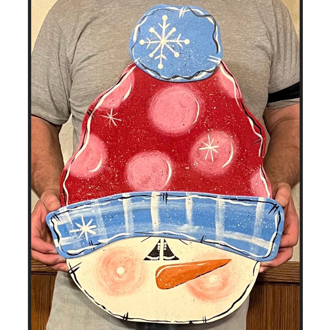 He measures about 21” wide and is made of 1/4” wood that hubby cut, and then he’s painted with love ❤️. There are two layers or wood as the brim and ball on top of hat are attached separately. It has dimension!!