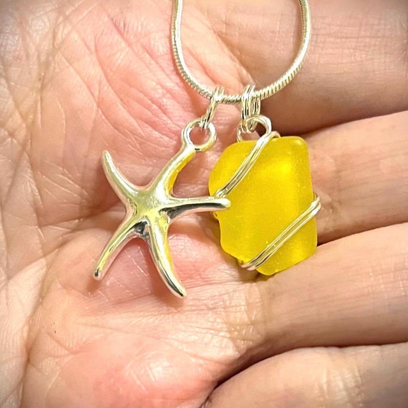 Sea Glass Necklace, Gifts for Her, Sterling Starfish, Wire Wrapped Jewelry, Italian Sea Glass, Yellow Sea Glass, Rare, Sterling Chain